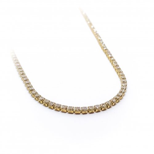 Design refinado e impacto visual: Este colar apresenta uma delicada sequência de zircônias cravejadas, que refletem a luz de forma impecável, realçando sua beleza natural. Com acabamento folheado a ouro 18k, o colar combina a sofisticação do ouro com a luminosidade das zircônias, criando um visual deslumbrante e atemporal.