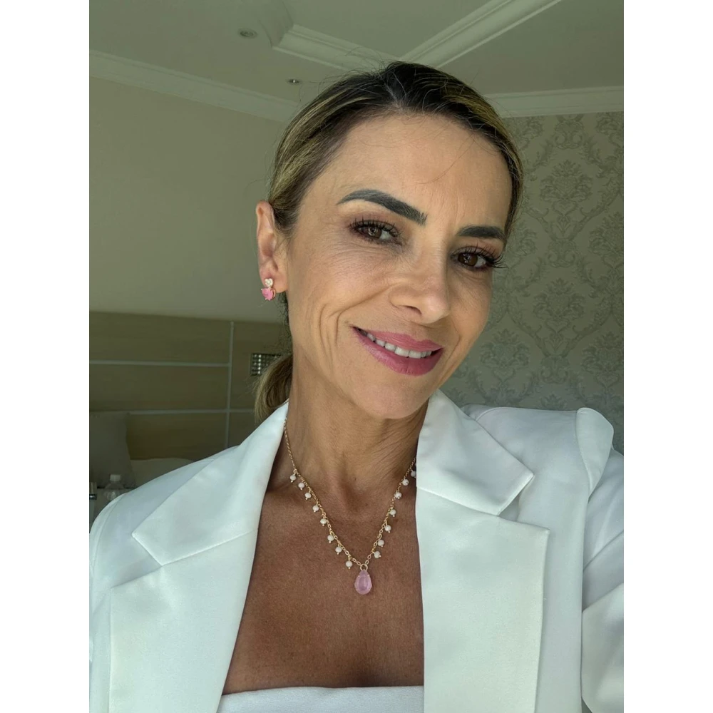 Colar Cristais e Pedra Gota no meio pendurada Rosa Fusion Banhado ouro 18k - 6353
